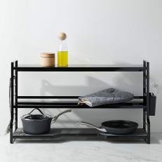 You can never have too much storage in the kitchen. Take advantage of that awkward space behind your stove or near your fridge, and add this wire stand to the mix. You can customize the front panel with hooks and caddies, and hang up your measuring spoons, scissors, oven mitts and more.