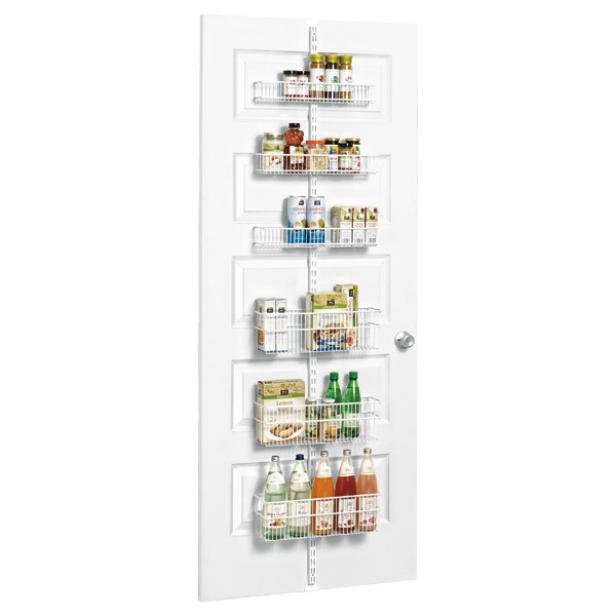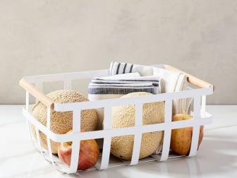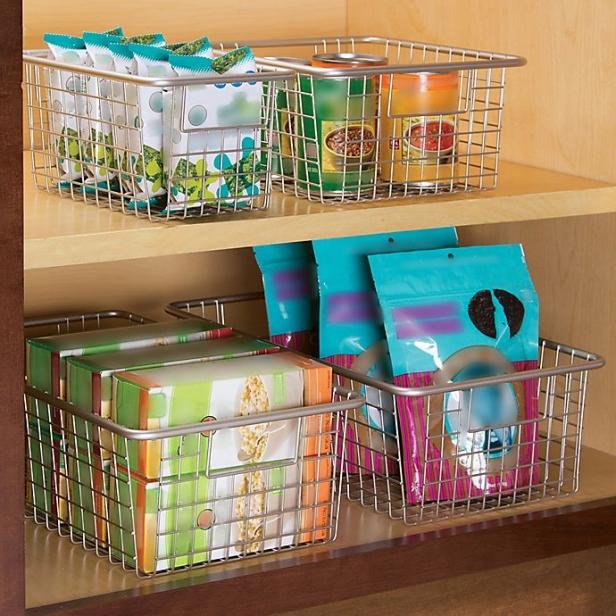 If you’re trying to cut down on plastic, simply opt for wire baskets. The grid-like design is perfect for containing snacks, canned goods or even root vegetables (like onions and potatoes). And wire baskets often have integrated handles, which make it easy to take those products off the shelves and into the kitchen.