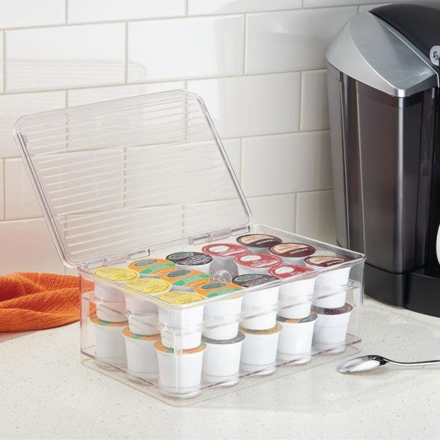 Some people toss all of their single-use pods into one bin, but that can make it more difficult to find specific flavors. Instead, neatly arrange your pods in a clear plastic tray for easy visibility. The tray below features a lid, so you can buy two (one for coffee pods and one for tea bags) and stack them neatly on top of each other.