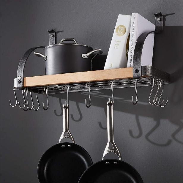 Free up room in the cupboards and add a little French country charm to your kitchen with a hanging pot rack. Something with an integrated shelf can give you an extra spot for Dutch ovens, cookbooks or plants.
