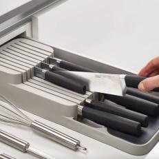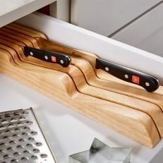 Knife blocks can take up a lot of room and make your countertops look crowded. Luckily, there’s an easy fix: Relocate your knives to the wall or utensil drawer. A magnetic knife bar will lift your blades out of the way, while an in-drawer knife block will lay them horizontally.