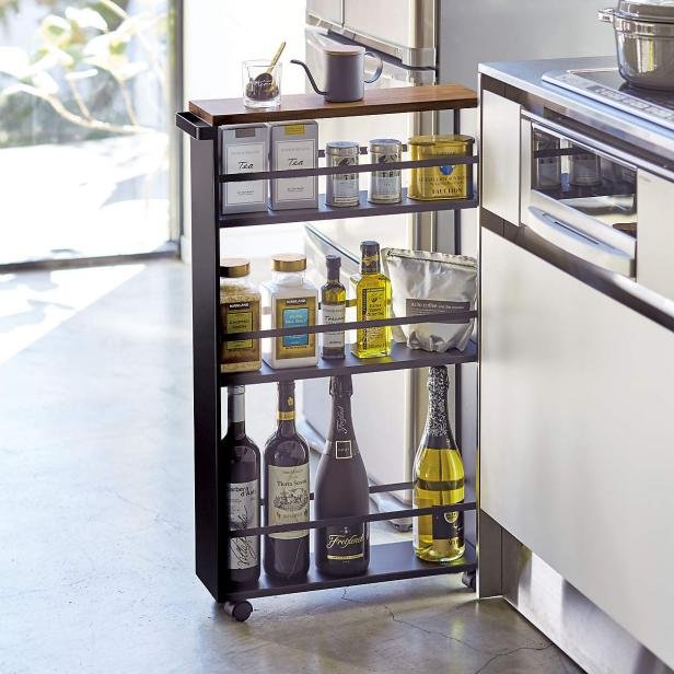 If your kitchen is tight on storage, consider investing in a rolling cart or island. Something thin like this would fit neatly against the side of your fridge or stove, and give you a little extra room for bottles of olive oil or your tea collection.