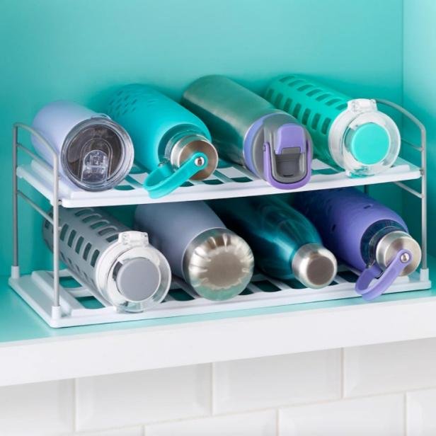 Water bottles fall over way too easily. Skip the messy cabinets, and store your bottles on their sides, so you can grab one without knocking others over. You could also use this clever YouCopia bottle stand to corral sippy cups — just put it on a lower shelf where your little one can reach it.