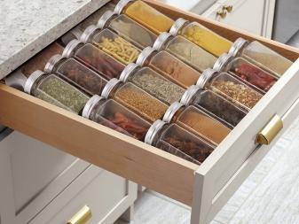 Store appliances in deep drawers or pull-out shelves to free up counter space. Arranging them vertically, as pictured here, allows you to quickly select the right tool for the job. Labels help but aren’t necessary. Aren’t blessed with deep kitchen drawers? Take apart tall appliances, like blenders, so they fit neatly in smaller spaces.