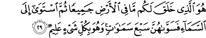 “Dialah Allah menciptakan segala apa yang ada di bumi untukmu, kemudia Dia (Allah) menuju ke langit. Dan Dia maha mengetahui segala sesuatu.”