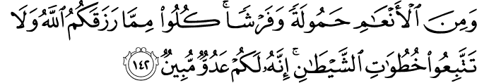 “Dan diantara hewan-hewan ternak itu ada yang dijadikan pengangkut beban dan ada (pula) untuk disembelih. Makanlah rezeki yang diberikan Allah kepadamu, dan janganlah kamu mengikuti langkah-langkah syaitan, karena sesungguhnya syaitan itu musuh yang nyata bagimu.”