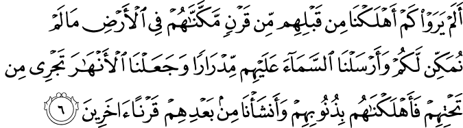 “Tidakkah mereka memperhatikan berapa banyak generasi sebelum mereka yang telah Kami binasakan, padahal (mereka) telah kami teguhkan kedudukannya di bumi, yaitu keteguhan yang belum pernah Kami berikan kepadamu. Kami curahkan hujan, yang lebat utnuk mereka, dan Kami jadikan sungai-sungai mengalir di bawah mereka, lalu kami binasakan mereka karena dosa-dosa mereka, dan kami ciptakan generasi yang lain setelah mereka.”